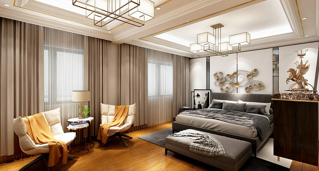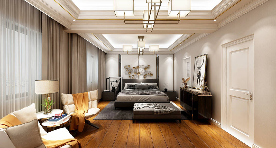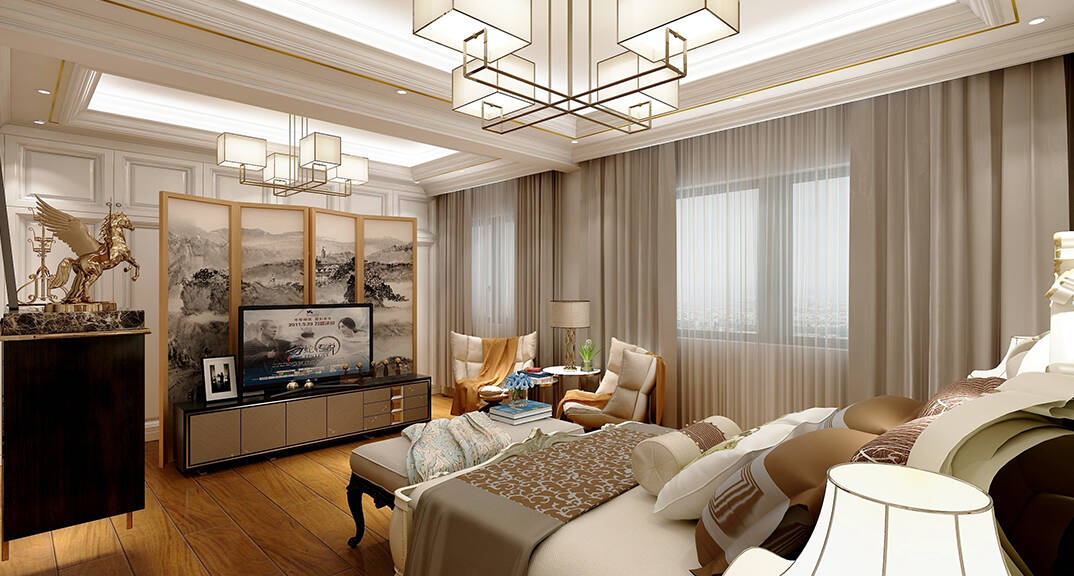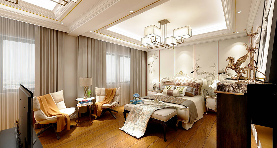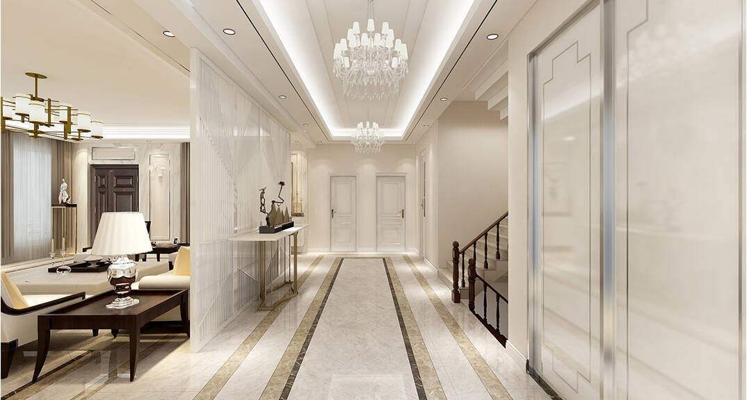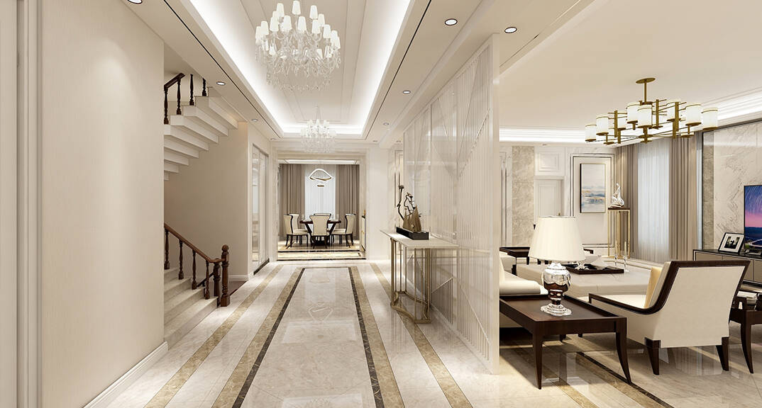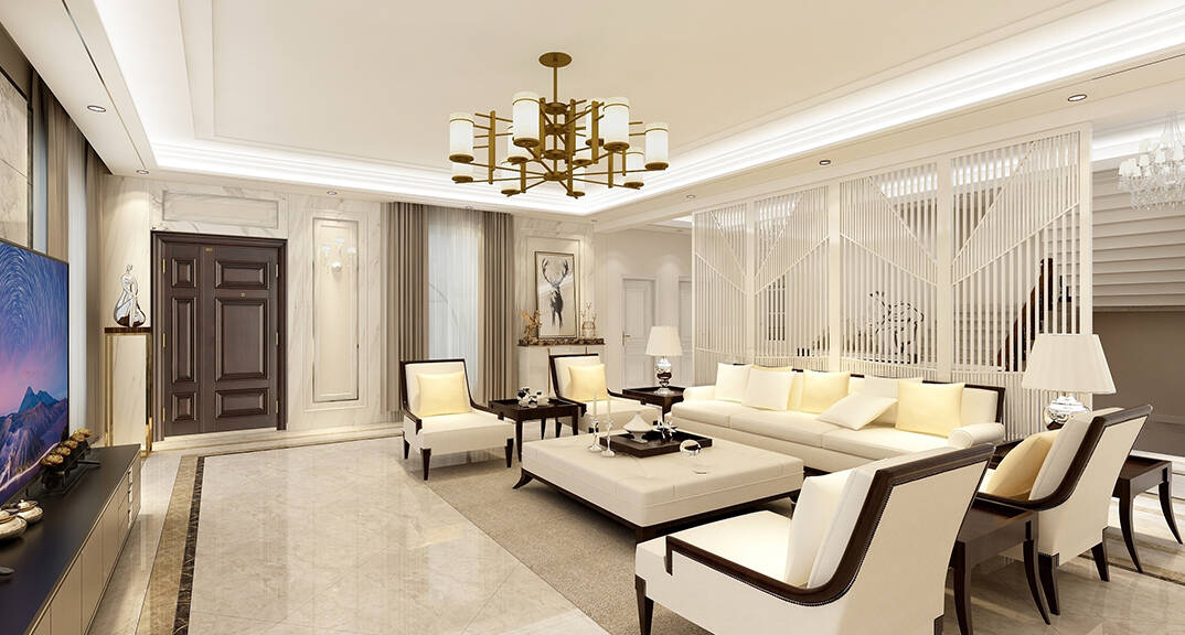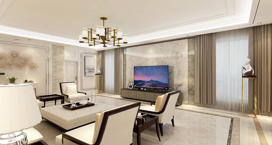 客廳明快鮮明,使用大量的石材以及部分木飾面裝潢使空間顯示出寬闊而富有歷史氣味,臥室布置較為溫馨,作為主人的私密空間,主要以功能性以及實用舒適為斟酌的重點