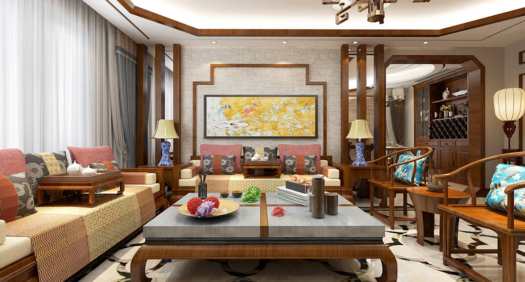 海怡半山216㎡三室二廳三衛(wèi)客廳新中式風(fēng)格裝修案例效果圖