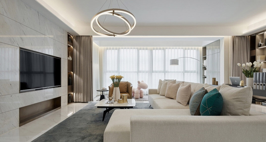 天一仁和瓏樾海125㎡別墅上疊客廳現(xiàn)代輕奢風格裝修研發(fā)效果圖