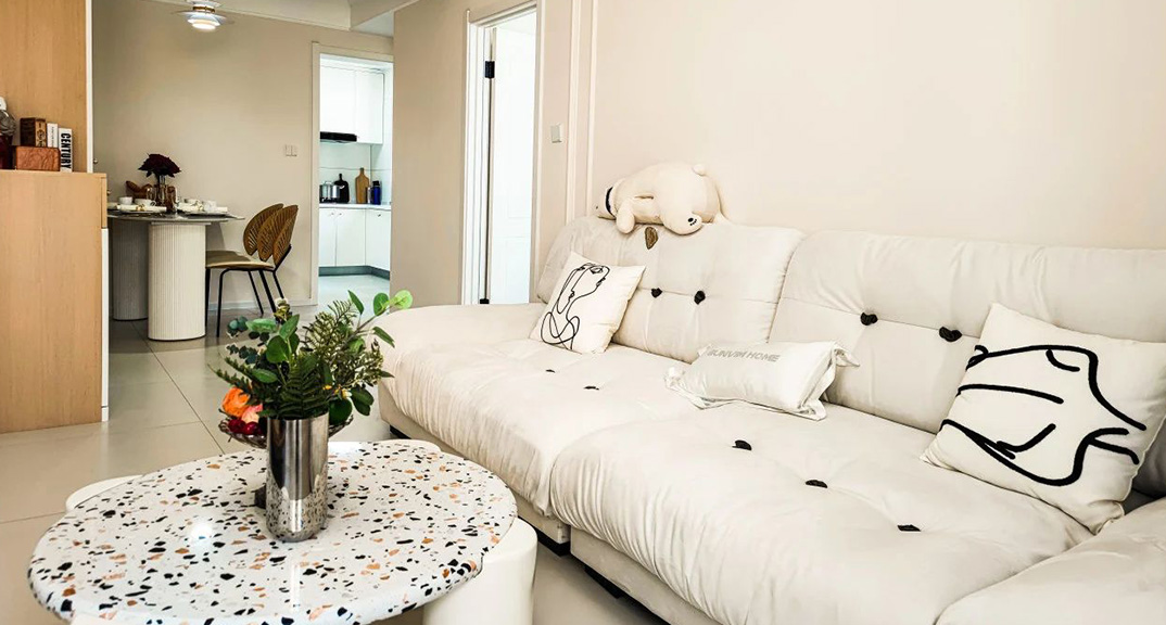 客廳使用肌膚釉面全瓷磚,搭配原木色柜體,客廳沙發(fā)的選擇更傾向于舒適度,用的和整個(gè)空間同一色系的暖白色,點(diǎn)綴金屬五金,石膏角花等小細(xì)節(jié)。營(yíng)造低調(diào)的浪漫,整體高級(jí)又治愈。