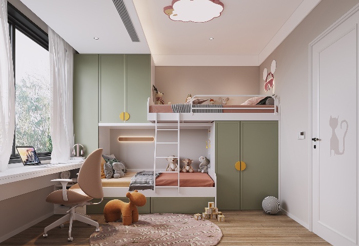 考慮足夠的睡眠空間:如果空間允許,可以放置兩張單人床,或者選擇上下鋪,為孩子們提供獨(dú)立的睡眠區(qū)域。同時(shí),要確保床鋪的安全性,避免尖銳的邊角。