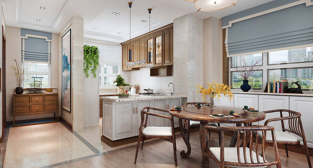 一般采用"啞口"或簡約化的"博古架"來區(qū)分;在需要隔絕視線的地方,使用中式的屏風(fēng)或窗欞,通過這種新的分隔方式,展現(xiàn)出中式家居的層次之美。
