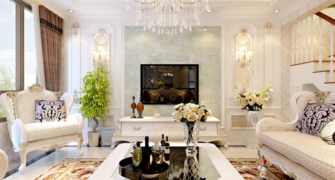 中海臨安府160m2別墅上疊一層客廳電視背景墻法式風格裝修案例效果圖