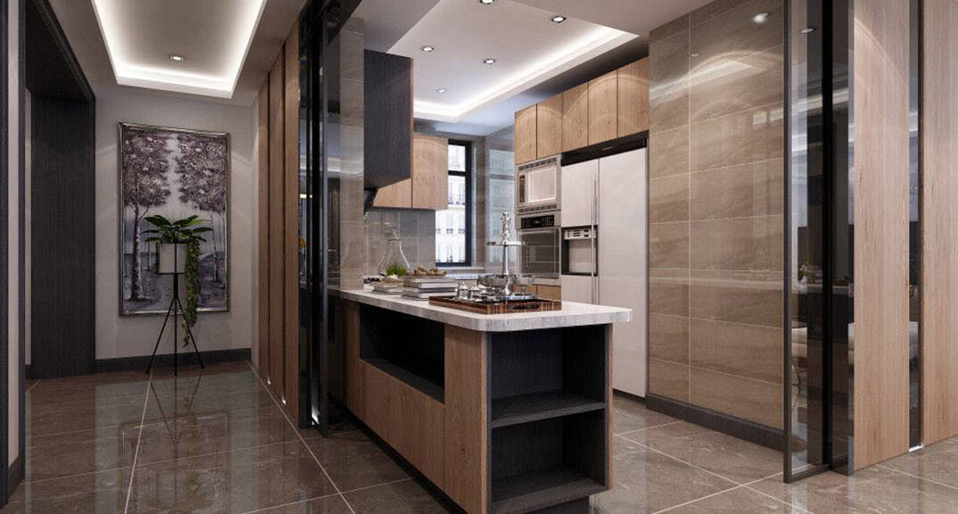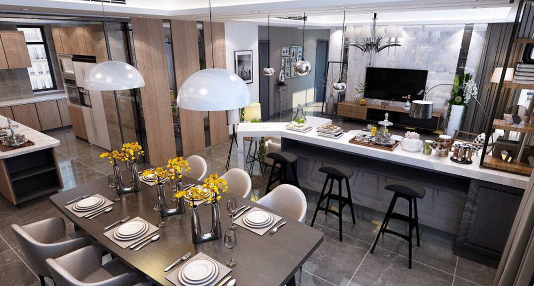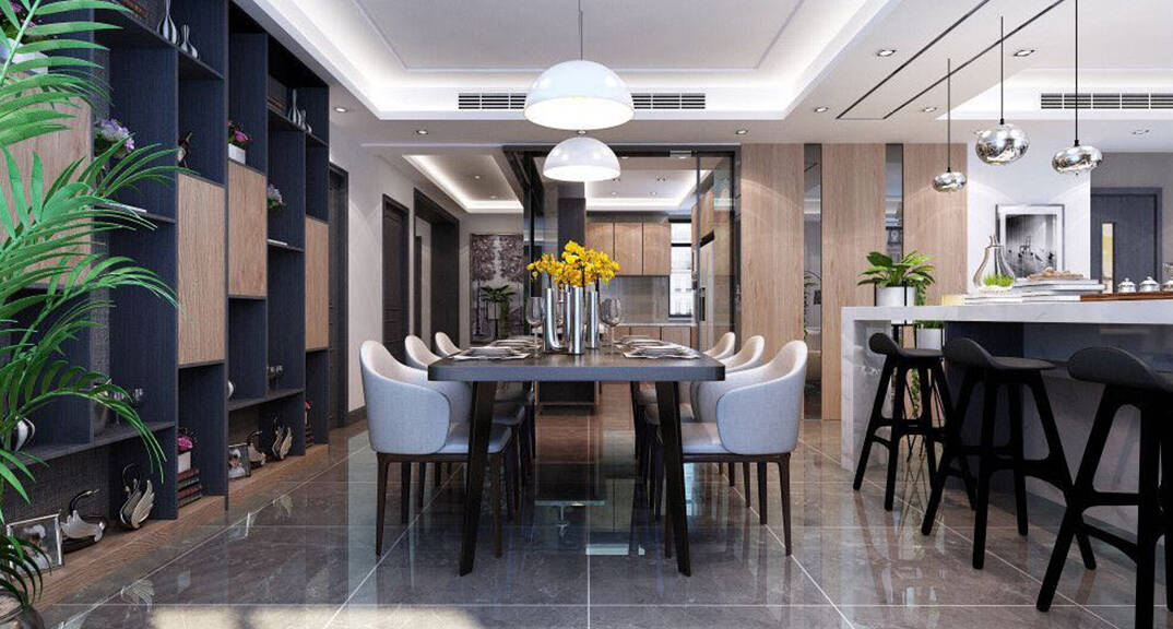 客餐廳以黑、灰、白作為現(xiàn)代空間的三線基調(diào),展現(xiàn)獨一無二的時尚簡練風(fēng)格,帶出內(nèi)斂低調(diào)的現(xiàn)代中式質(zhì)感,以躍層空間的實用性,創(chuàng)造出高低變化的豐富景色,這就是現(xiàn)代港式設(shè)計的精髓。
