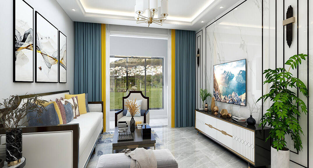 鑫江桂花園120㎡二室一廳二衛(wèi)客廳新中式風(fēng)格裝修案例效果圖