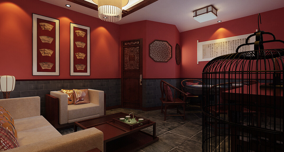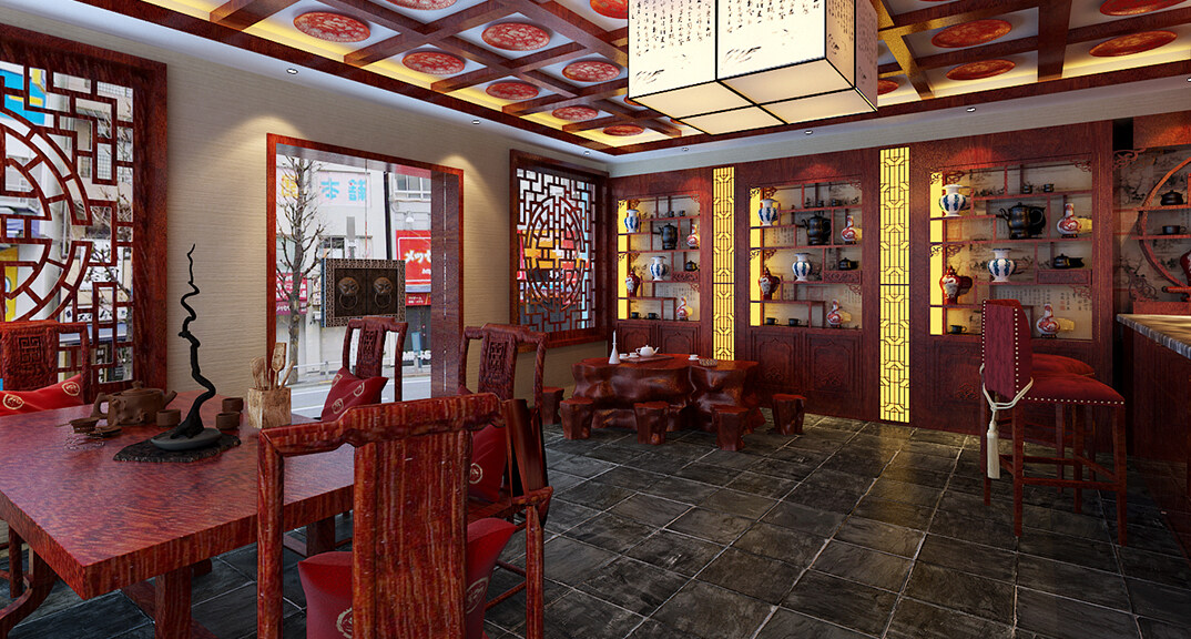 茶樓裝修200㎡茶室中式風(fēng)格案例效果圖-夏紅
