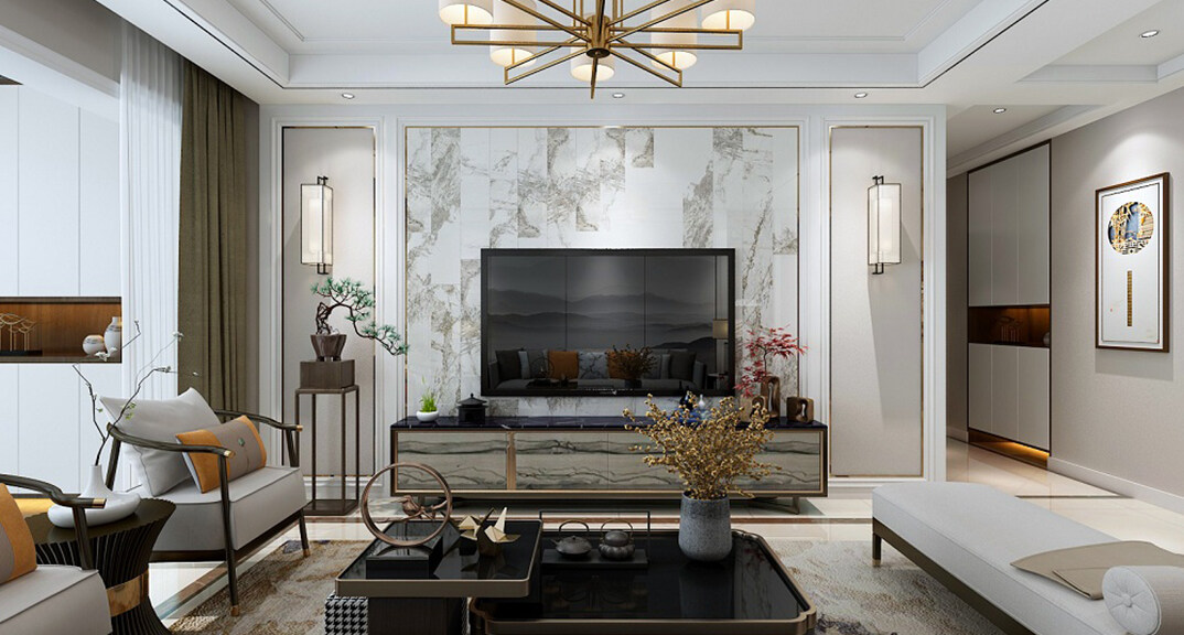 海信·紹興路66號(hào)130㎡三室二廳客廳電視新中式風(fēng)格裝修案例效果圖