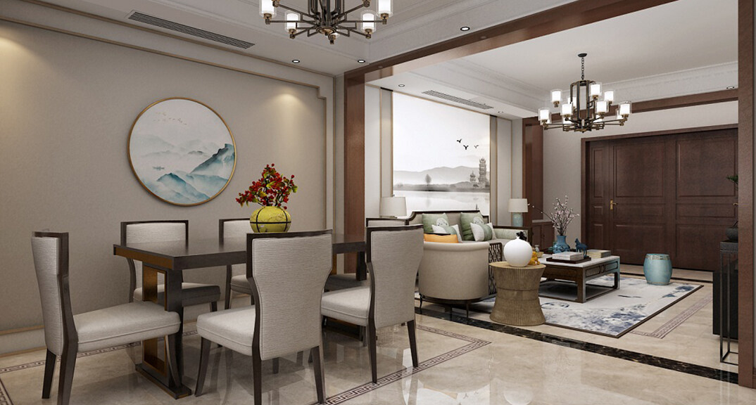 楓林小鎮(zhèn)230㎡別墅客餐廳新中式風格裝修案例效果圖