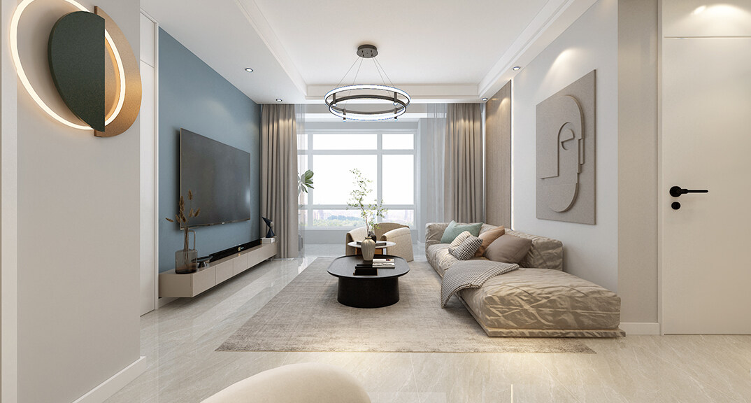 越秀天悅海灣97㎡三室一廳客廳電視現(xiàn)代輕奢風(fēng)格裝修案例效果圖