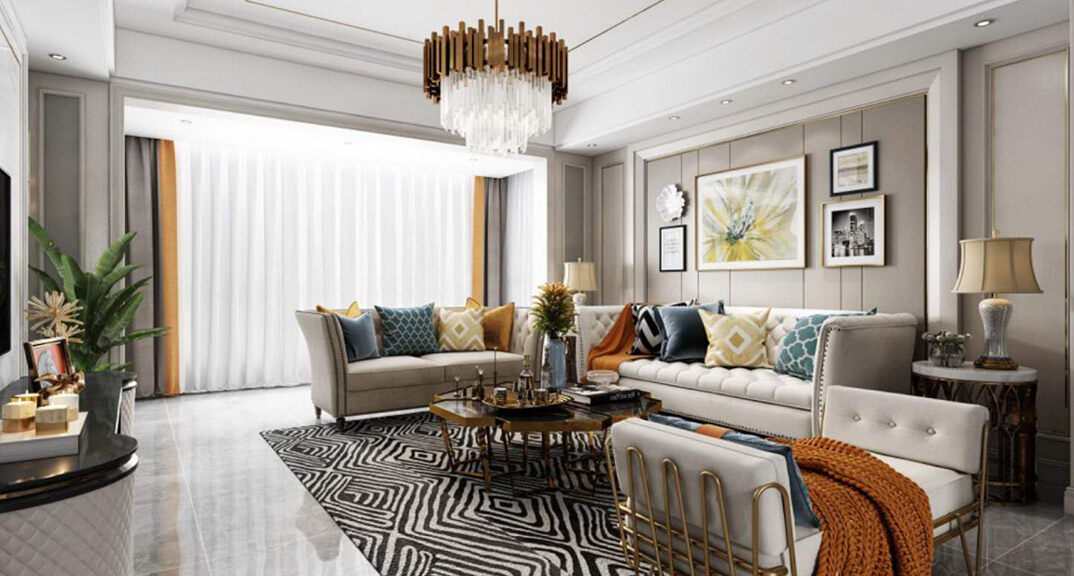 曉港名城140㎡三室兩廳客廳沙發(fā)現(xiàn)代簡約風(fēng)格裝修案例效果圖