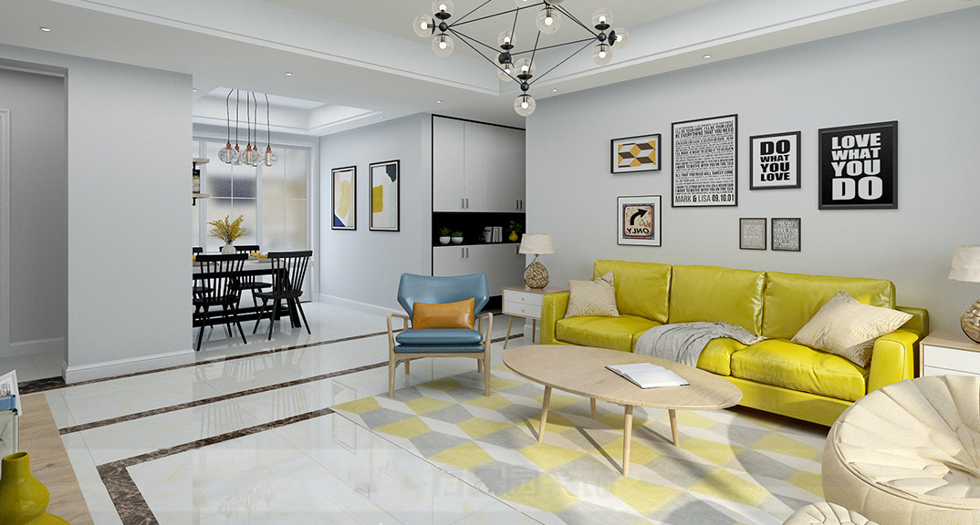 永利國際134㎡三室兩廳客餐廳沙發(fā)北歐風(fēng)格裝修案例效果圖
