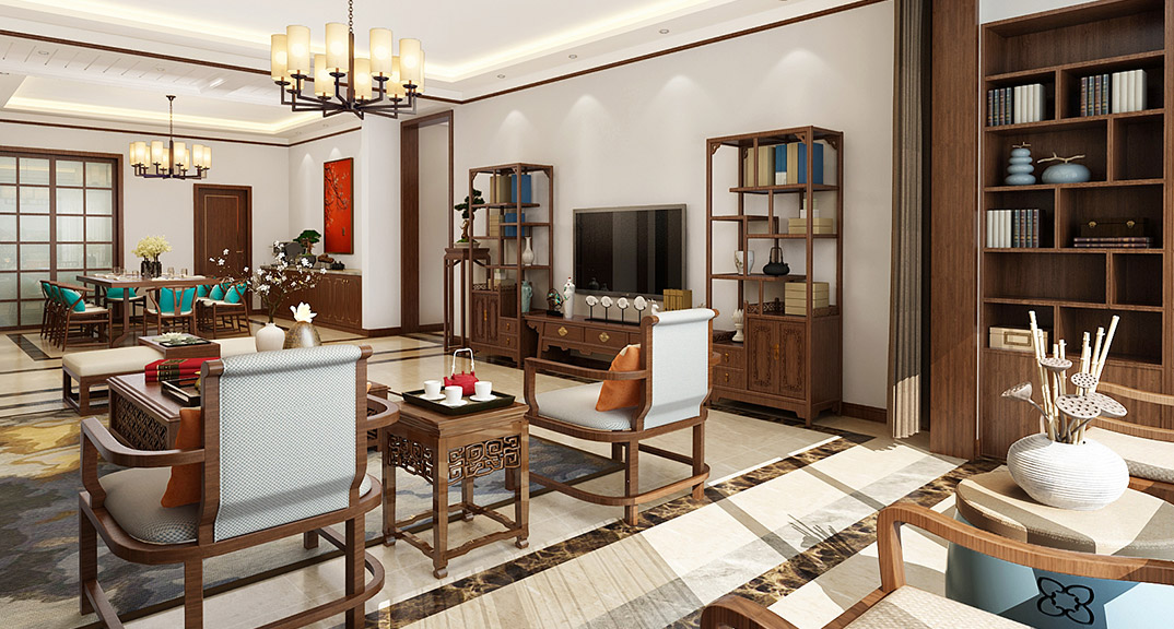 市直三區(qū)260㎡平層客廳新中式風格裝修案例效果圖