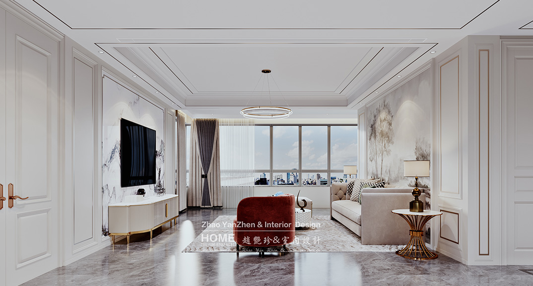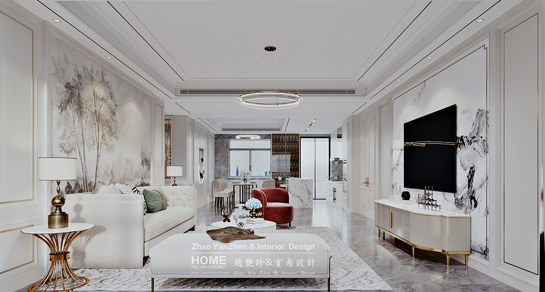 璞麗豪庭287㎡疊拼上疊客廳美式輕奢風(fēng)格裝修案例效果圖