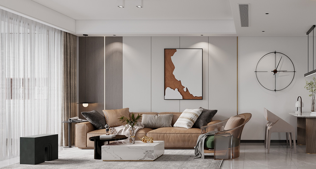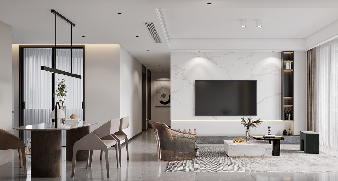開放式布局給予的通透視野,讓自然風光成為客廳的背景板,呈現出虛實相生的生活圖景,如此一來,足不出戶也能獨攬一方美景。讓自然光影與室外風景成為矚目的背景板;淺色系的主色調實現輕薄的視覺效果,不顯壓抑;大理石與木質元素相互交融,兼顧質感與溫情。