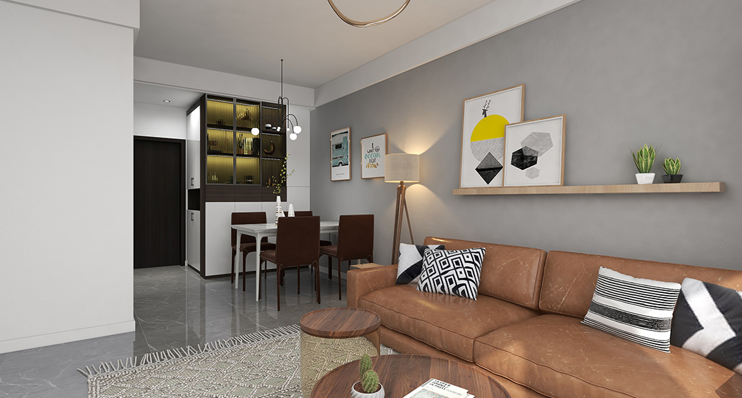 簡約中有一種高級(jí)感,造型簡約的沙發(fā)放著靠枕進(jìn)行搭配,多邊形的茶幾上放著精致的擺件,看起來很有質(zhì)感,客廳整體給人一種簡約高雅的感覺。