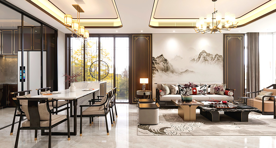 仟佰墅150㎡別墅上疊客廳新中式風格裝修案例效果圖