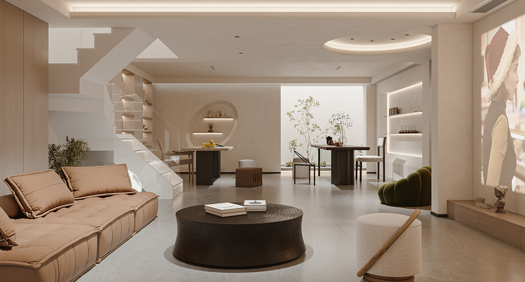 紫荊閣300㎡別墅下疊客廳新中式風(fēng)格裝修案例效果圖