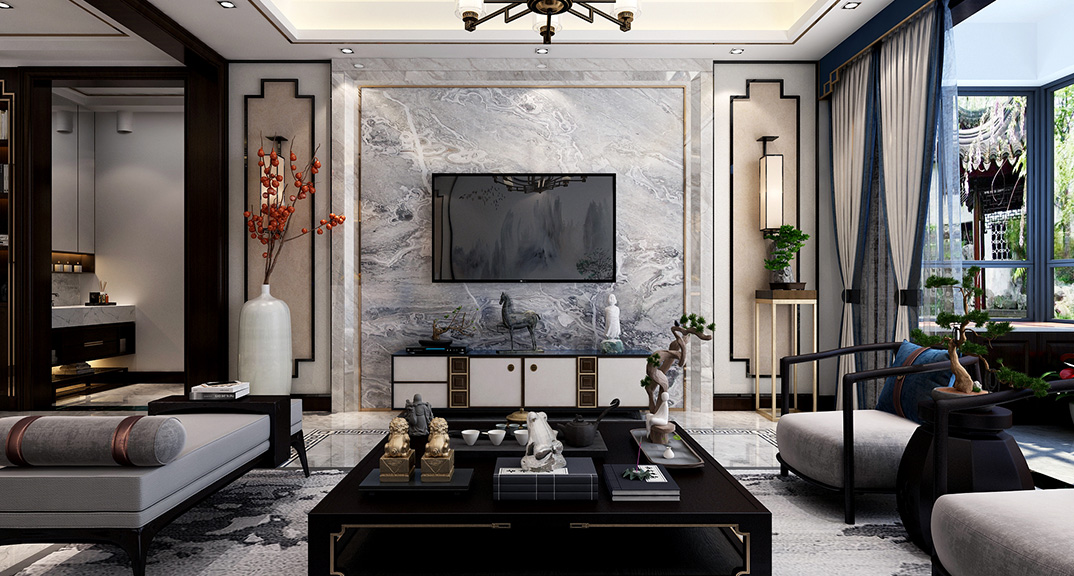安泰名筑190㎡四室兩廳客廳電視新中式風格裝修案例效果圖