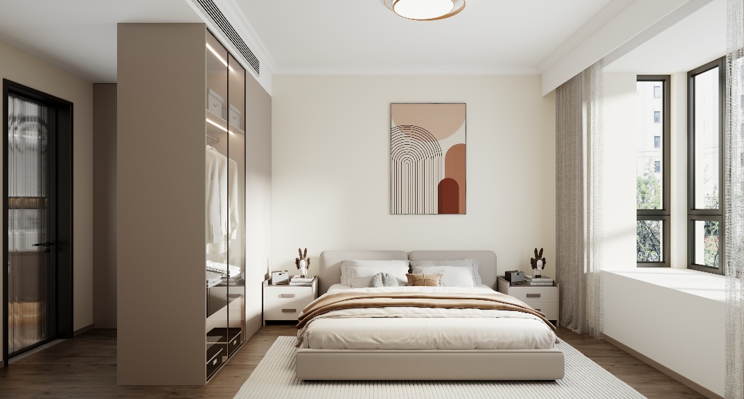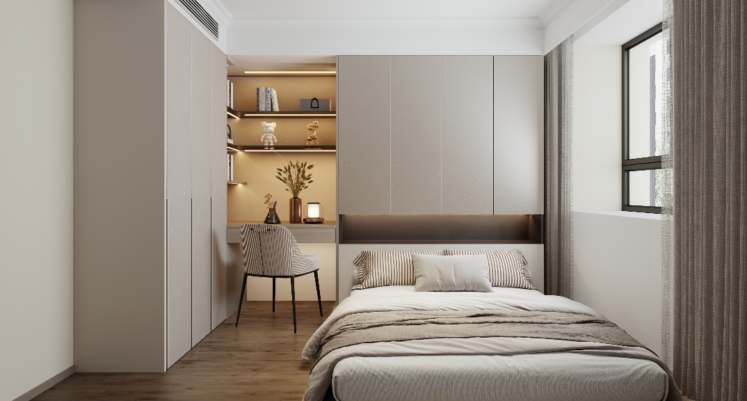 餐廳用六人桌+倒臺一體既滿足了多人就餐問題又能實現(xiàn)冰吧等品質(zhì)的提升,餐廳簡潔時尚,槍灰色色的線性燈吸引著眼球,與金屬餐廳酒柜呼應(yīng),整體色彩搭配和諧而充滿美感??蛷d做滿墻電視柜設(shè)計既滿足了展示品等小物品的儲藏又不影響觀影效果。主臥室做L型開放式衣帽間一點避免衛(wèi)生間門正對床的弊端,一點拿去衣服比較方便,臥室進門還能實現(xiàn)端景美觀又實用。兒童房用地臺床結(jié)合床頭衣柜一體化完美體現(xiàn),書桌結(jié)合玩具柜合理利用空間,活動空間也有空余。衛(wèi)生間玻璃隔斷保證了空間的通透明亮,還能防止水分到干區(qū),沐浴區(qū)墻上做壁龕,收納洗浴用品正合適。主衛(wèi)采用了連續(xù)性,相同的空間形成一個較大的視覺縱深,層次更豐富,具有更強的流動性。