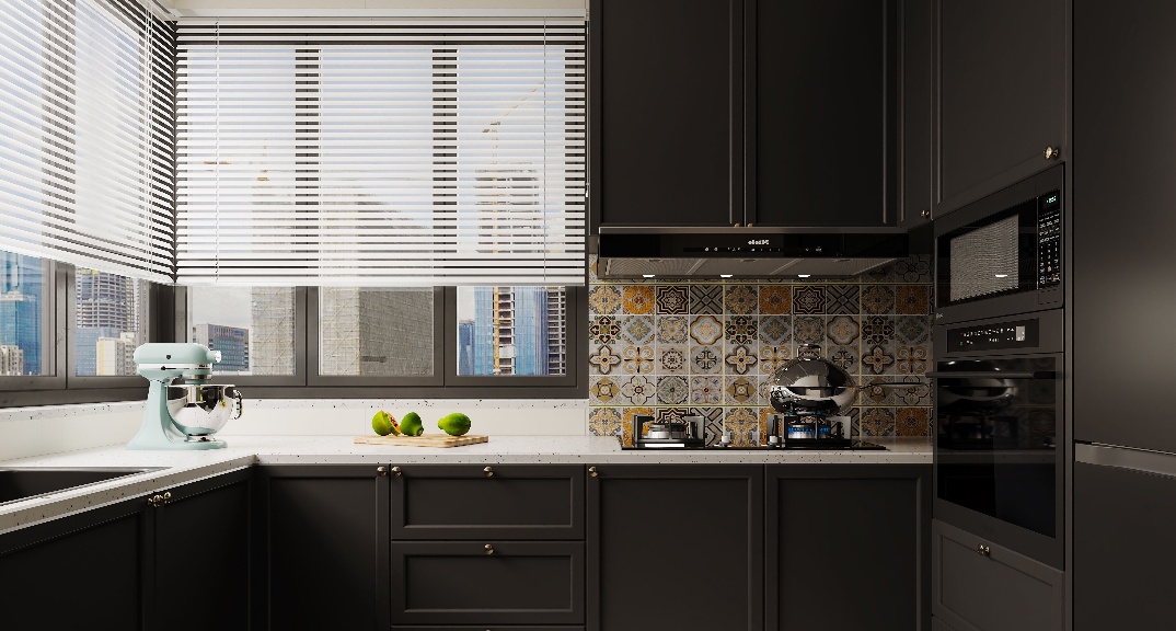 原始戶型廚房空間很寬敞,衛(wèi)生間想要把洗手盆拿出來,占用廚房的空間。因加裝電梯,廚房多出來 1.5 米的空間,這樣也不影響整體尺寸。