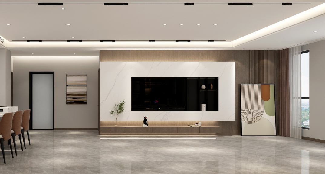 入門玄關(guān)柜處采用木紋加膚感門板搭配燈光,氛圍感十足;沙發(fā)背景采用的是膚感飾面搭配同色格柵,木紋飾面與巖板做點(diǎn)綴,與電視背景、電視柜相呼應(yīng)。
